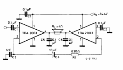 This circuit is from the 1982 SGS linear integrated circuits manual. The integrated circuits must be equipped with heat radiators and the supply of 14.4 V is for automotive use. The output power is 20 W x 4 ohms.