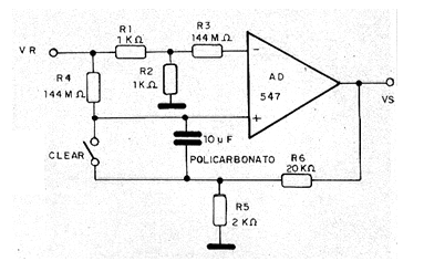 The existence of field effect transistors at the input of the integrated circuit (operational amplifier) of this application allows its use in timers of long periods. In fact, the time constant obtained with 144 M ohms resistors (7 resistors of 22 M ohms in series) together with the 10 uF polycarbonate capacitor, leads us to a 1000 second time delay. The integrated circuit must have symmetrical power and the clear switch serves to discharge the capacitor at the beginning of a new delay.
