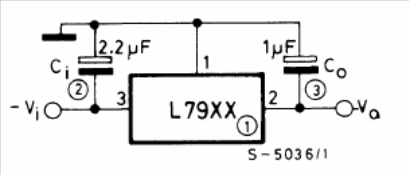 The integrated circuits of the SGS L79xx series are equivalent to those of the common 79xx series, consisting of negative voltage regulators. In the figure we have the basic configuration obtained from the SGS 1982 integrated circuits manual. The integrated circuit must be equipped with a heat radiator.