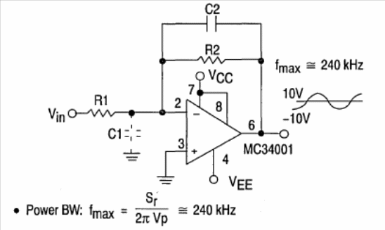 Other operational amplifiers from the same family such as MC34002, MC35001, MC34004 and MC35004 can also be used. The circuit is from Motorola's 1993 Linear Interface ICs. The power supply must be symmetrical.