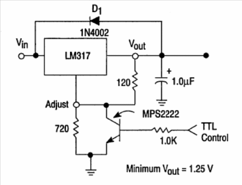 This circuit can be controlled by a TTL signal. The signal can come from common logic or from the outputs of a microcontroller, functioning as a shield. The circuit cuts the output current at a high TTL level. We found the configuration on Motorola's Linear Interface ICs. The maximum output current is 1.5 A.