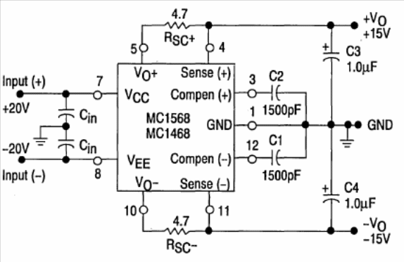 This circuit is the basis of a symmetrical 15 V supply. MC1468 can also be used. They are not currently common components, as the circuit is from Motorola's 1993 Linear Interface ICs.