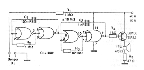 This application consists of a circuit that trips when the sensor resistance drops below a few megohms. This value is determined by resistor R1, in the circuit in the figure. When the circuit is triggered, it produces an intermittent tone, generated by an oscillator like that of the previous circuit (CIR8137). To use as a water alarm (water level or flood), the sensor consists of two wires with peeled ends. Their contact with water or moisture causes the alarm to go off. To use as a touch sensor, the sensor consists of two metal plates that must be touched simultaneously. One possibility is to ground the negative of the source and use only one flat iron as a touch sensor. In this case, the wire to the sensor must not exceed 1 meter, so that the captured noise does not cause an erratic trigger.