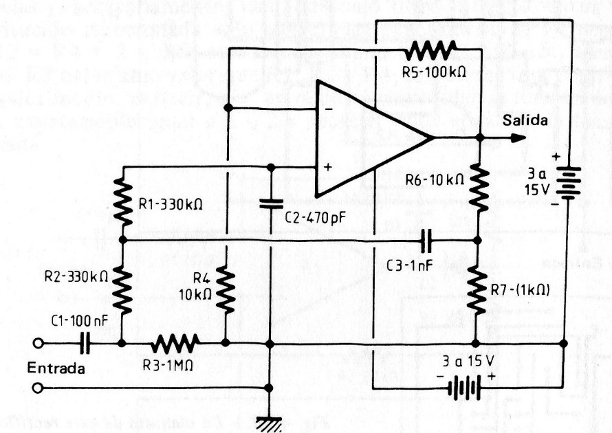 The cut-off frequency of the circuit shown in the figure is 750 Hz, with the components used. The circuit applies to almost any operational amplifier and the power supply must be symmetrical.