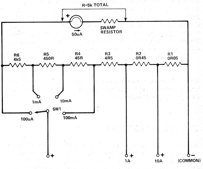 The presented circuit measures currents and voltages with precision that depends on the tolerance of the resistors used. The instrument is a microammeter and more scales can be added.