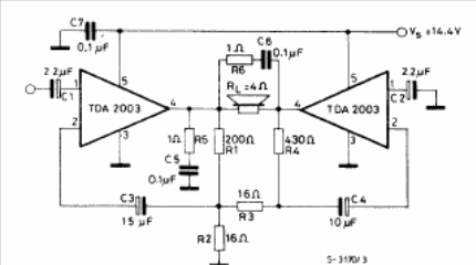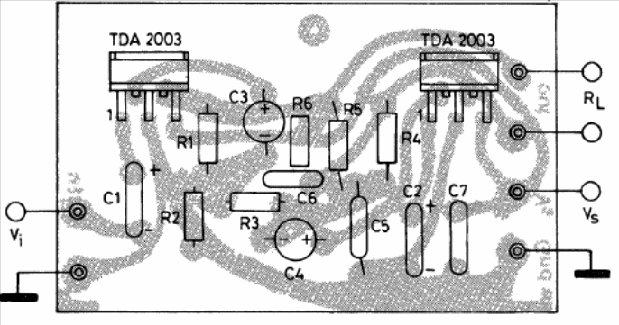 This bridge amplifier (BTL) is from the SGS linear integrated circuit manual. The circuit is suitable for use in cars and the integrated circuits must be equipped with heat radiators. Suggestion of printed circuit board is given next to the diagram.