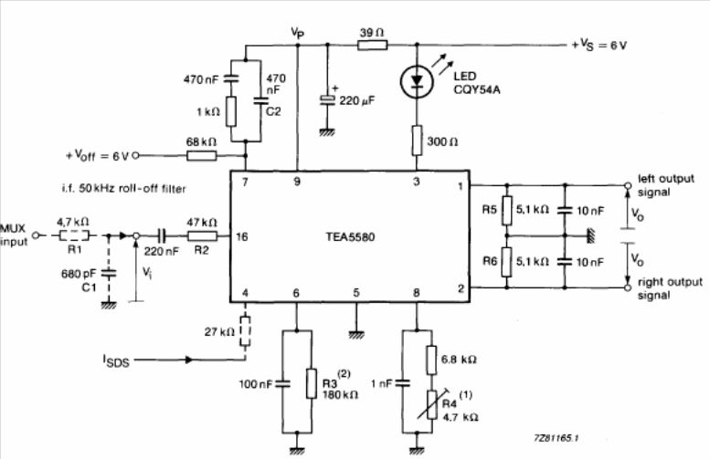 We found this circuit in the 1990 Philips Databook. The circuit is a commercial application of the decoder in stereo FM radio receivers.
