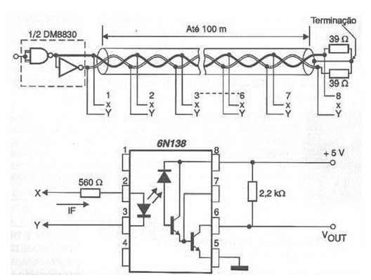 In the figure we show the typical configuration of a shared line using a twisted pair where the circuit with the 6N138 can be used. Up to eight circuits can be used in the circuit. The line driver IC is conventional, and the maximum recommended line length is 100 meters. The typical data transfer speed is 180 kB / s (which corresponds to typical rise and fall times of 3 us). The loads can be randomly distributed along the line.