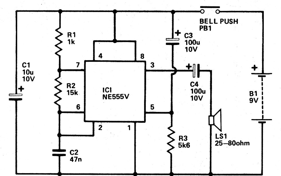 This circuit was suggested by a 1979 documentation, and a ceramic transducer can be used in place of the high impedance speaker. Capacitor C2 can be changed to modify the sound emitted. The supply can be done with voltages between 5 and 12 V.