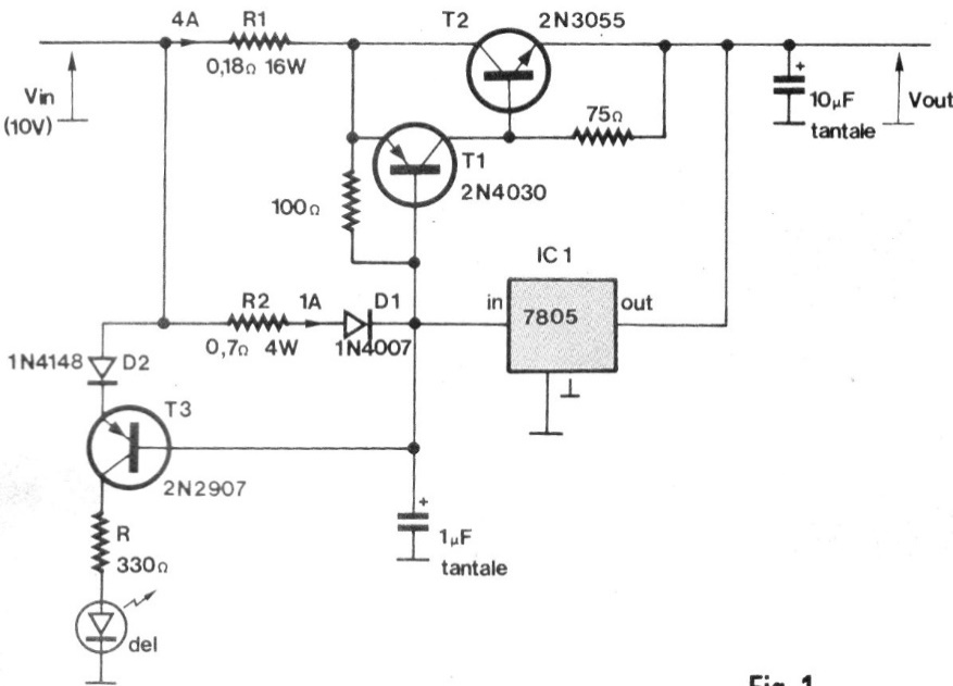 This circuit was found in an old French documentation, but it is current if we use the BC547 for T3 and BD136 for T2. The 2N3055 and the integrated circuit must have heat sinks. The input must be from 8 to 12 V.