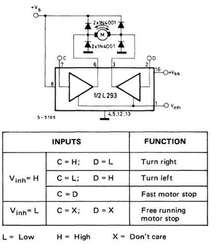 The L293 circuit is not common today. We found this circuit in the 1982 SGS linear integrated circuit manual. The table below shows the motor control mode up to 1.5 A. The circuit can be used as a shield for microcontrollers.