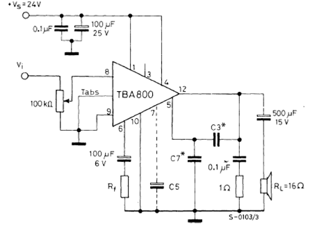 This circuit has a load connected to the ground providing 5 W of power at 16 ohms. The circuit is from the SGS linear integrated circuits manual. Capacitors C3 and C7 typically have values between 10 and 100 nF.