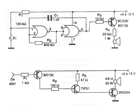 The oscillator shown in the figure generates a 1 kHz tone that is reproduced on the speaker with good power. For supplies up to 6 V the transistor can be the BC558, but for higher voltages, given the developed power, the BD136 or TIP32 is recommended, which must be mounted on heat radiators. The circuit frequency can be changed by changing R2 values. Values between 100 k and 1 M ohms can be experienced. Capacitor C1 can also be changed to obtain tones from other frequencies. A piezoelectric tweeter can be used to generate ultrasound in the range of 18 to 25 kHz with the necessary changes in R2 and C1. In the same figure we give a suggestion of a high-power stage to excite a speaker with the 2N3055. The 2N3055 transistor must be mounted on a good heat radiator and the speaker must be at least 15 cm with a power of 20 W.