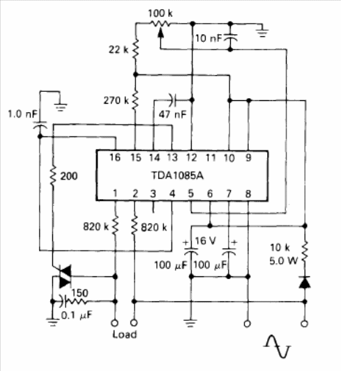 This circuit is from the Motorola Linear Databook of 1990. The circuit controls a Triac from a dedicated integrated circuit. The component is not very common today.
