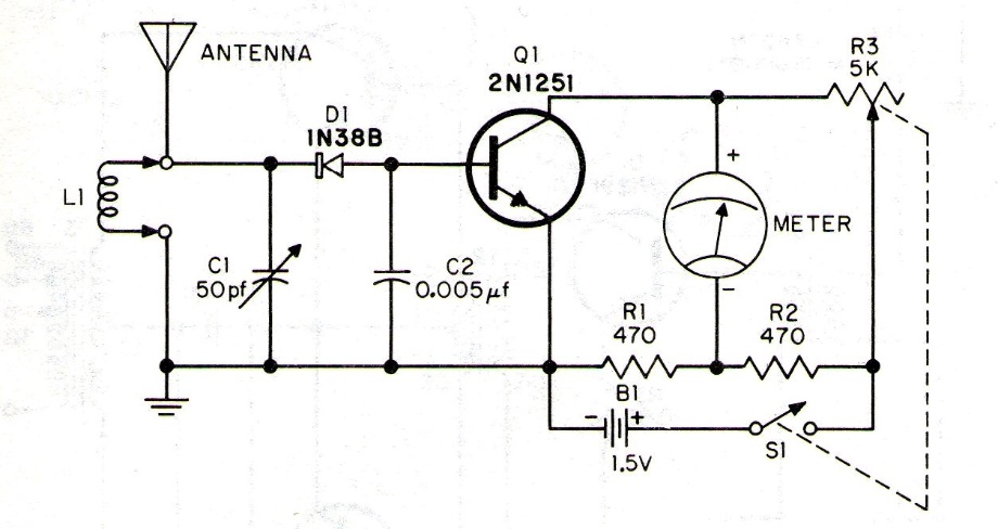 We found this circuit in an American documentation from 1964, but it can be easily assembled today, as the components are not critical. The circuit serves to evaluate the emission of radio-amateur transmitters. The L1 coil depends on the analyzed frequency range.