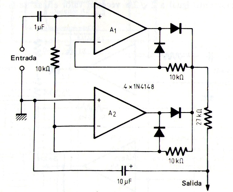 This symmetrical configuration uses two operational amplifiers to obtain the rectification of a full wave signal. The power source must be symmetrical, and the circuit applies to almost any operational amplifier.