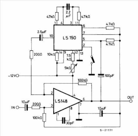 This “compandor” circuit has the opposite effect of CB15195E. The LS150 is not common today and the power is 12 V. The LS148 is an operational amplifier that admits equivalent. The circuit is from the 1982 SGS Linear Integrated Circuits Manual.