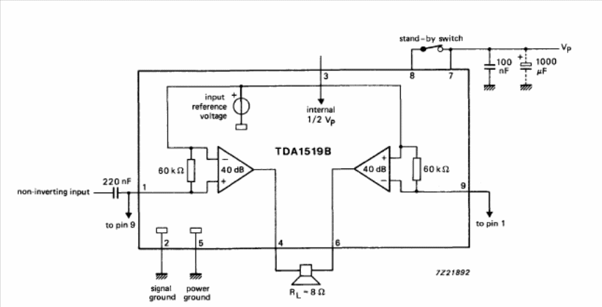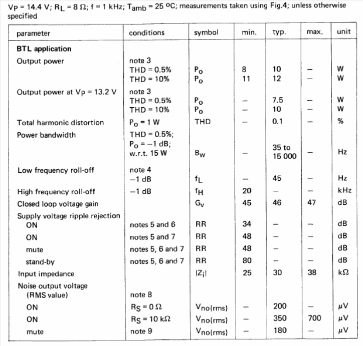We found this amplifier for automotive use in the Philips Databook of 1990. The circuit has a bridge configuration, and the characteristics are given in the table below the diagram.