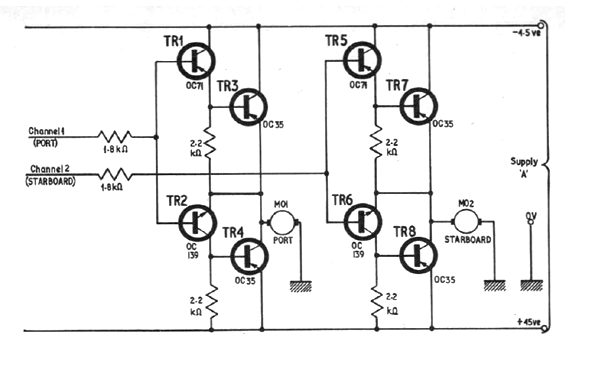 This motor control for robots is from an English documentation from 1968. The original transistors are made of germanium, but we can use silicon equivalents and the voltage must be according to the motors used.
