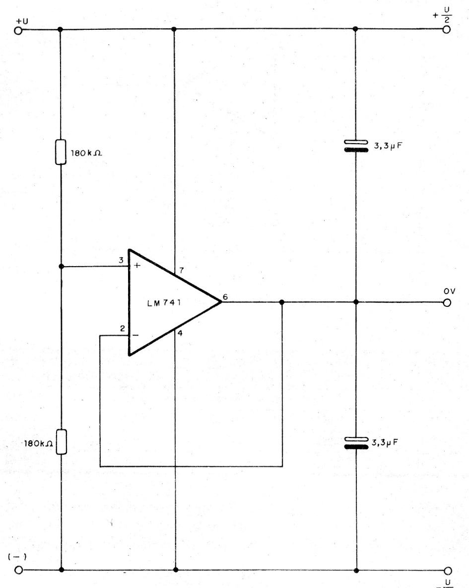 This circuit divides the voltage of a 6 to 15 V source by 2 in order to obtain a symmetrical source. The maximum current is in the order of 20 mA. Operational equivalents can be used. The circuit is from a 1993 publication.