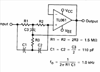 There are several manufacturers of the TL061. The configuration given specifically was taken from Motorola's Linear Databook. Next to the diagram are the formulas for calculating the components for a given frequency. The power supply must be symmetrical.