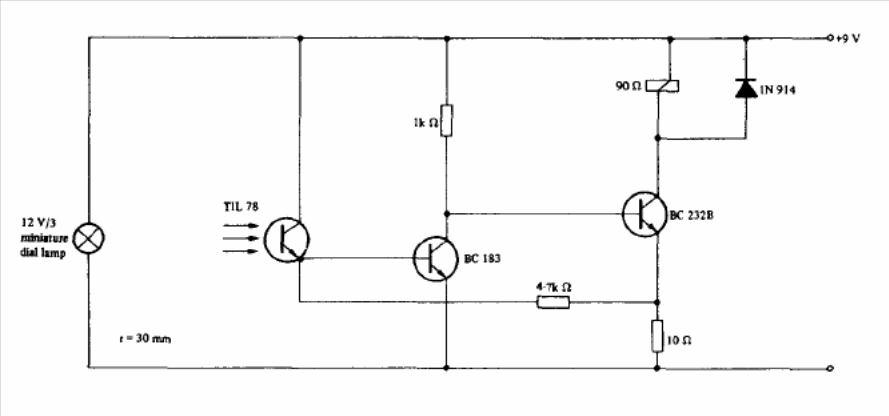 The selected circuit was obtained in a Texas Instruments opto-electronics manual. The transistors can be the BC548 and to activate the relay a higher current transistor can be used. The voltage can be changed according to the relay.