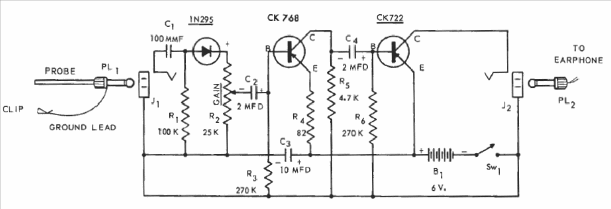We found this circuit in a 1957 Raytheon transistor publication. The circuit can be assembled with more modern transistors with minor changes. The handset must be high impedance magnetic.