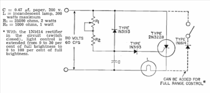 This traditional dimmer configuration for incandescent lamps and heating elements was found in an RCA transistor manual. SCR can be a more modern equivalent like TIC106, depending on the power grid.
