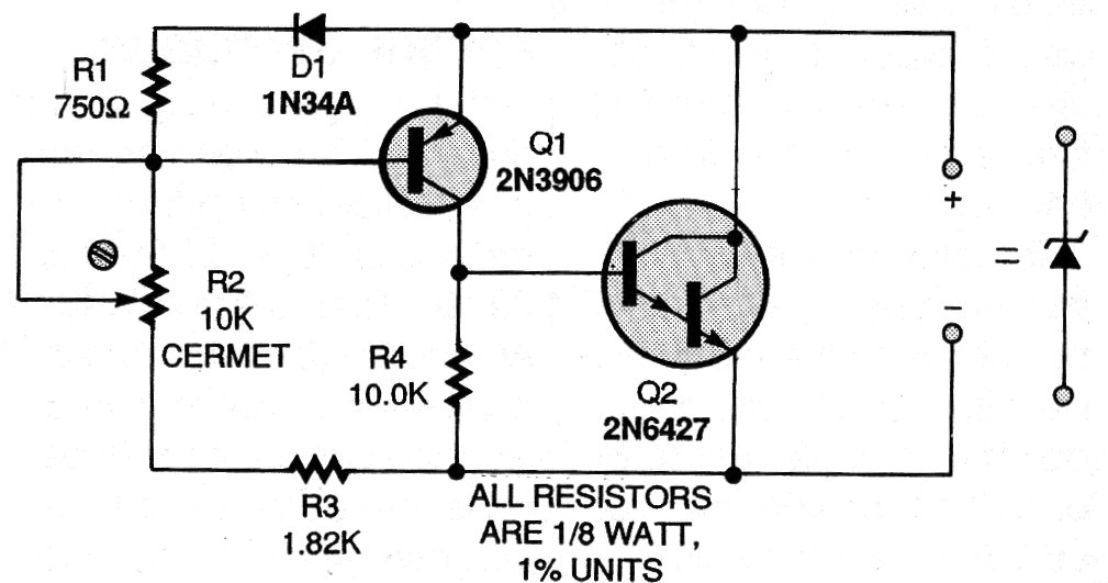 The presented circuit simulates a high power zener that depends on the characteristics of the Darlington used. This transistor can be any one of the TIP series. The adjustment of the simulated zener voltage is done in a trimpot. The power transistor must be equipped with a heat sink.