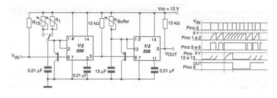The circuit in the figure alerts you when the frequency of the pulses applied to your input, which are associated with the speed of a motor or mechanism, exceeds a certain value, set in the potentiometers connected to the first timing circuit. The corresponding waveforms are shown in the same figure, observing that the output of the second timer goes to a low level when the input frequency exceeds the set value. In the diagram we represent a double 555 (556) but separate 555 can also be used with equal performance. The intensity of the input pulse (negative pulses) must be capable of triggering the 555. Grounded reed sensors or even common mechanical sensors can be used for this purpose.