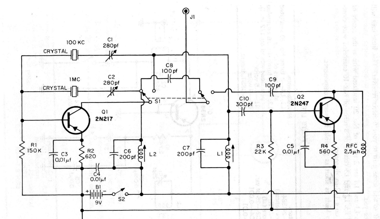 We found this circuit in old American documentation. It can be implemented with more modern transistors like the BC558. The circuit generates fixed signals according to the frequency of the crystals. L1 and L2 are RF coils approximately 1 mH.