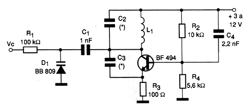 In the figure we show a Varicap-controlled VCO capable of generating signals in the range of a few megahertz up to more than 200 MHz. Although frequency control is achieved when using a varicap like the BNB809, even a common diode like the 1N4002 works as such, but with a smaller range of performance. The coil, C2 and C3 depend on the central frequency generated according to the following table: