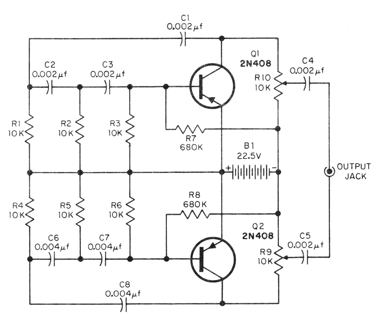 This circuit, from an American publication of 1964, generates two tones determined by the double T in each transistor. The tones are mixed by the potentiometers and applied to the output. The transistors can be the BC558 and the supply can be made with voltages from 15 V.
