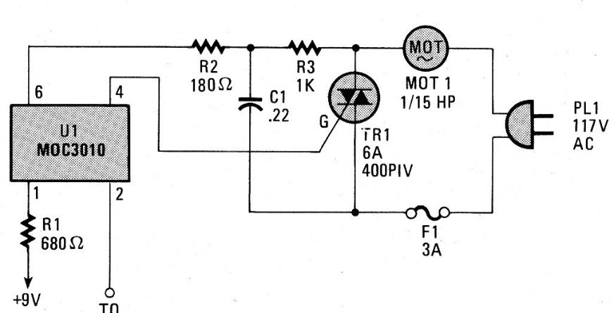 This circuit isolates a stage with Triac from a TTL or CMOS trigger circuit, for example. The circuit can be used with triacs of the TIC series with current according to the load controls, a motor, for example. We found this circuit in a Poptronics from the 90s.