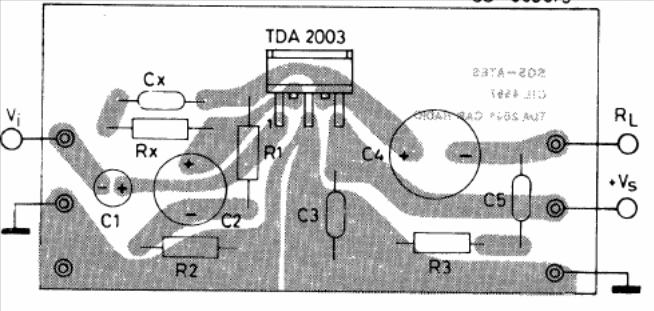 This car amplifier was found in the 1982 SGS Linear Integrated Circuits manual. The circuit can be powered by voltages from 8 to 18 V and the load impedance can be between 2 and 8 ohms. The printed circuit board is given next to the diagram.