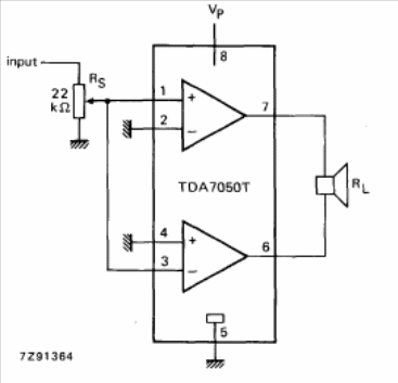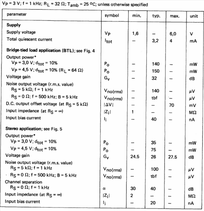 This low power amplifier circuit for speaker or phone is from the Philips Databook of 1990. The circuit has the power according to the power supply and the characteristics are given in the table.