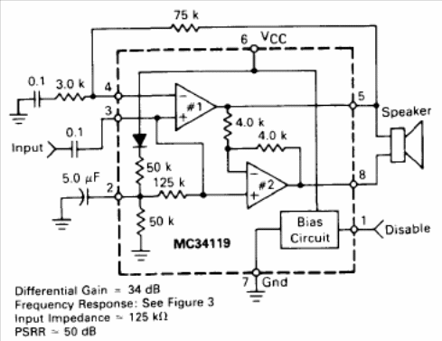 This circuit is suggested by Motorola in its 1990 Linear Databook. The speaker (or headphone is 32 ohms impedance, and the power supply is 6 V.