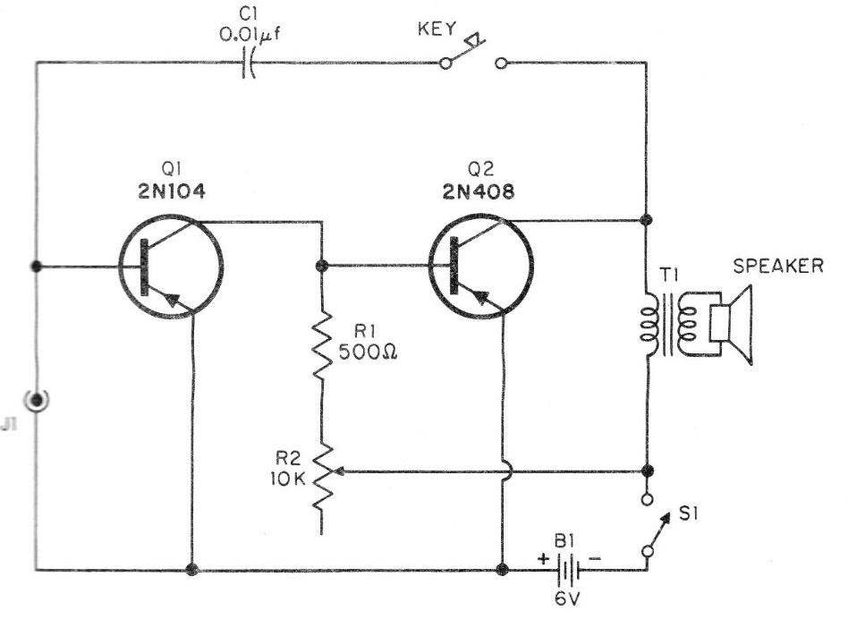 We found this circuit in a 1964 publication. The circuit is both an amplifier and an oscillator for the practice of telegraphy with the sound determined by C1. The transformer is an output type for transistors and BC558 transistors can be used in place of the original types.