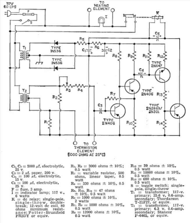 We found this circuit in the 1964 RCA transistors manual. The transistors used are uncommon today, but they can be used equivalent. The circuit controls the operation of a heating element.