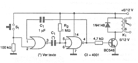 The circuit in figure 10 uses two of the 4001's four ports to trigger a relay in a timed manner. The time interval obtained depends on the capacitor C1 whose value can be between 10 uF and 1 000 uF. With 10 uF the time interval obtained is in the order of 10 seconds. Large capacitor values can make the circuit unstable, especially if they leak. The relay is of the type that has a maximum coil current of 50 mA and voltage equal to that used in the supply.