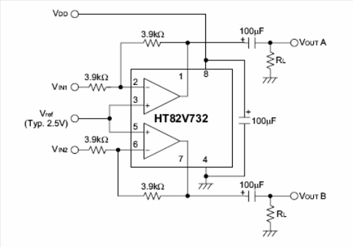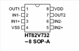 In the figure we have an audio amplifier suitable for portable applications in both mono and stereo (BTL) versions. The diagram shown is for the stereo version, but in the original Holtek documentation that manufactures the HT82V732, the integrated circuit used in the project, the bridge application can be found. The integrated circuit is supplied in an 8-pin SOP enclosure. The pass-through range is 20 kHz and the gain without feedback is 70 dB. In the same figure we have the pinout of the CI.