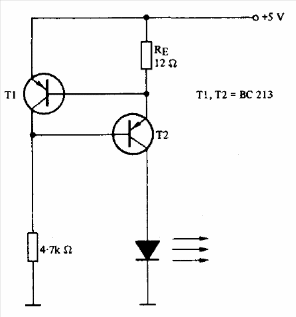 The circuit shown is from a 1978 Texas Instruments optoelectronics manual. The circuit can use equivalent transistors and the current in the LED, of the order of 20 mA, can be changed by changing the RE.