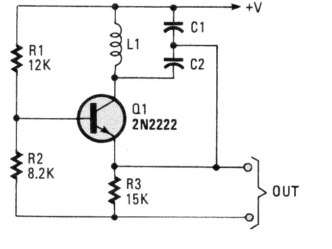 The frequency of this oscillator depends on the coil and capacitors C1 and C2. For 1 MHz L1 is formed by 80 turns of wire 28 in a 1 cm tube and C1 and C2 of approximately 220 pF. The supply voltage can be between 9 and 12 V.