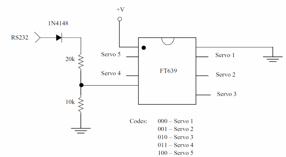 With this circuit, from Newton C. Braga's Mechatronics Sourcebook it is possible to control up to 5 servos from the serial port of a computer. The voltage depends on the servos and the pulse programming is done on the computer or microcontroller.