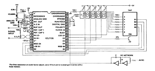 This circuit is from the 1983 Intersil Databook. In it we have the use of the ICL7135 as an AD converter for a 4 and a half digits multiplexed display. The circuit can be found in many commercial instruments.