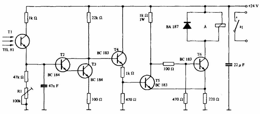 This sensitive circuit was found in a Texas Instruments optoelectronics manual. The transistors can be BC548 and the power supply is according to the relay used. The diode can be 1N4148. R1 is the sensitivity setting.