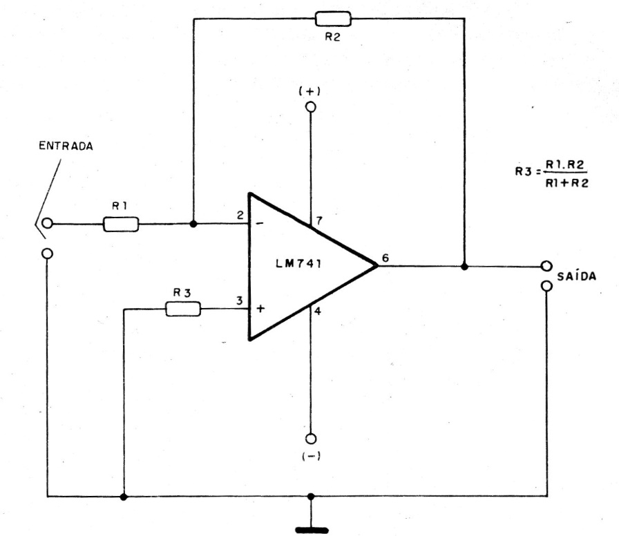The gain of this amplifier depends on the component values as well as the operating range and the input impedance. In the figure we have the diagram and the table with the values and characteristics. The values apply to operators with characteristics close to 741.