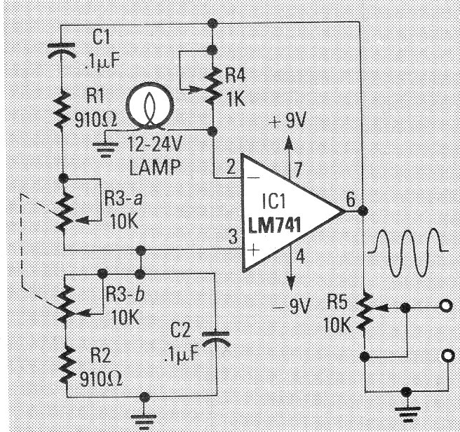 This circuit was obtained in an American publication of 1989, but the components are current. The signal is sinusoidal and for the values of the indicated components the frequency is around 1 kHz. Other operational amplifiers can be used and, the power supply must be symmetrical.