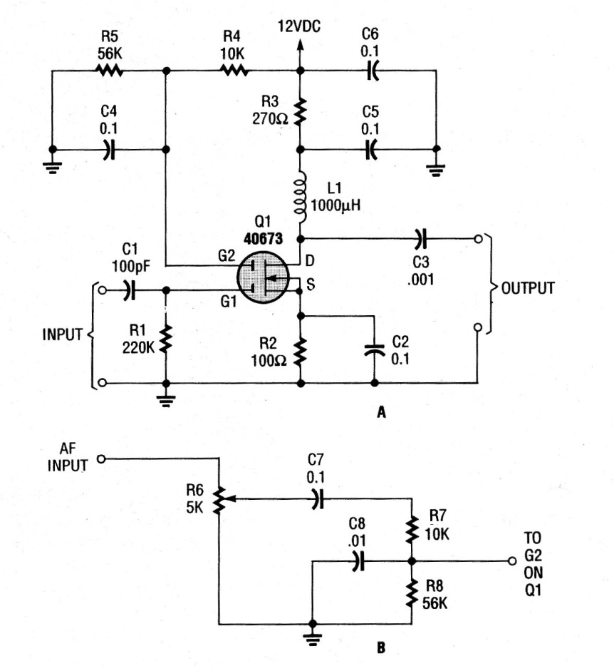 This circuit was found in a Poptronics of the 90's. The FET is double-gate, and the frequency comes from an external oscillator connected to its input. The supply must be made with 12 V.
