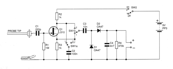 With this probe it is possible to analyze RF signals on the oscilloscope or multimeter. The FET can be BF245 and the diode should preferably be germanium. The circuit operates with frequencies up to close to 100 MHz.